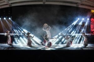 The stories behind Vietnam’s five elements are told in short yet spectacular segments. After a short water puppet show underpinned by the elements ‘water’ and ‘wood’, ‘earth’ is depicted by dancers and magicians gathering silks to craft a colossal lotus flower. ‘Fire’ is marked in fiery style, with a magician performing a fire sword show before the dramatic rescue of a dancer in a large cage that bursts into flames. Following a mesmerising Non La (conical hat) dance, a contemporary take on the element ‘metal’ encompasses all sorts of visual effects during the flash mob and elegant Ao Dai fashion parade.