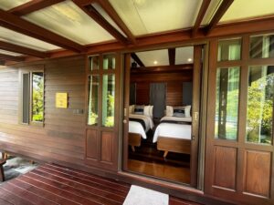 The resort was born from a deeply personal vision: a Thai woman with over two decades of international hotel management behind her, and a lifelong passion for art and design, set out to create not just a place to stay, but a place to belong. That intention is felt the moment you arrive. The wooden stilt houses, the shaded verandas, the canal that runs alongside the property, the mountains visible through the canopy — none of it feels accidental. Everything has been considered, and everything has been chosen with care.