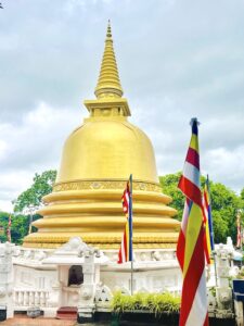 On the day I visited, the weather was overcast, and rain was coming and going—a typical pattern in Sri Lanka’s monsoon season. Despite the gloom, the golden hue of the statue shone brightly, and the atmosphere was filled with a sense of devotion. Devotees and monks were seen lighting incense sticks and walking around the statue, engaging in prayer and meditation.