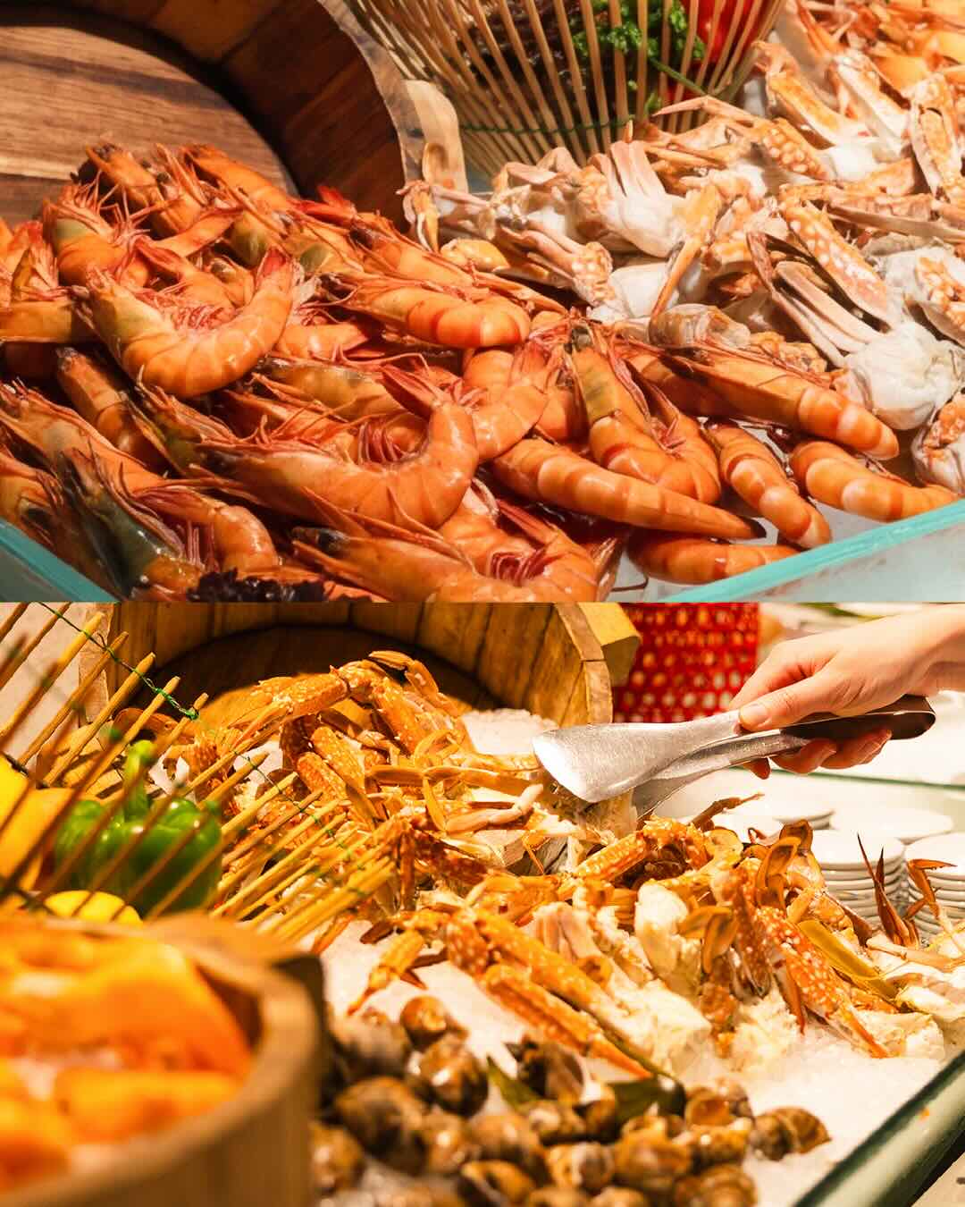 Indulge in a premium brunch buffet featuring carefully curated, high-quality selections. Highlights include generous cuts of salmon, freshly prepared sushi and sashimi, as well as an impressive seafood on ice display featuring blue crab, oysters, prawns, New Zealand mussels, and snow crab claws.
